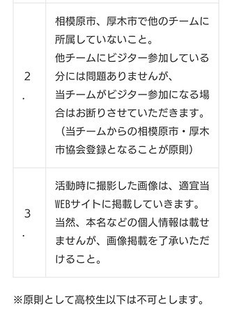 | こんな人を 探してます | 【男女とも部活経験者のみ募集中】月に1〜2回は参加できる方 ※ビジター参加不可 |