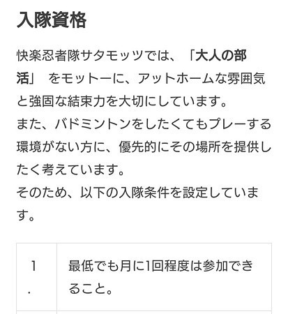 | 連絡事項や アピールポイント | -【はじめに】-------------- ⓪当サークルについて 活動場所は相模原市ですが、600mくらいで町田市に入るくらいの距離です。 電車でも町田駅から東林間駅まで2駅、中央林間駅からも徒歩で来れる距離です。 町田近辺でお探しの方、こちらも候補に如何でしょうか? 体験入隊の応募お待ちしてます。 ①直近の特記事項 参加希望日の数日前にご連絡ください。 練習当日の参加希望の応募は対応が間に合わない場合があるので、次週以降の練習に回させていただくことがあります。 詳しい条件は②③を確認ください。 年齢、経歴やレベルなど募集条件に合致しない方、および必要事項の記載の無い方からの応募はちゃんと読んで頂けてないと判断して回答しない場合がありますので、ご了承ください。 ②男性の募集について 部活経験者を募集しております。 募集年齢や参加頻度は下の【募集要項】の◆を参照ください。 ③女性の募集について 部活経験者を募集しております。 募集年齢や参加頻度は下の【募集要項】の◆を参照ください。 未経験者、初心者の方はすみません。 募集を休止しております。 また再開時はこちらにてご連絡いたします。 (しばらく募集の予定はありません) -【募集要項】-------------- ◆「入隊資格」について 下記の内容を確認いただき合意いただけること ①最低でも月に1回程度は参加できること。 ②相模原市、厚木市で他のチームに所属していないこと。 他チームにビジター参加している分には問題ありませんが、当チームがビジター参加になる場合はお断りさせていただきます。 (当チームからの相模原市・厚木市協会登録となることが原則) ③活動時に撮影した画像は、適宜当WEBサイトに掲載していきます。 当然、本名などの個人情報は載せませんが、画像掲載を了承いただけること。 「入隊資格」はこのページ上部の写真か、サークルHPでも確認できます。 https://www.saturmotts.com/team_info/ ※スマホなら上記URL長押しでHPを開けます ※協会登録は任意です ※月1回の参加は目安で家庭、仕事などの事情は考慮いたしますので絶対ではありません ◆経験者とは •学生時代にバド部経験者であること •ブランク有りOK ◆募集年齢について 所属メンバーの年齢平滑化のため、18(高校生不可)~39歳までの方とさせていただいております。※例外なし (40代以上の方すみません、当面はこの方針です) ◆参加頻度 •月に1,2回くらい参加できること (参加率高い人ほど嬉しいです) -【サークル説明】-------------- 某市が主催の男女混合の団体リーグ戦に当サークルから2チーム参加しています。一緒に参加していただける方だと嬉しいです。(参加は任意です。サークル所属条件ではないので安心してご応募ください。) ※お願い 当チームからの回答は"スポーツやろうよ!"からのメールで通知されると思いますので下記アドレスが受信できるようスマホ等の設定をお願いします。 info@mail.net-menber.com 基本的に1週間以内に回答しておりますが、通知のメールが送信されていない場合があるようです。 回答メールが無いと感じたらご自分でメッセージを確認していただくと回答済みになっている場合があります。 ◆参加費 男性700円/回 女性500円/回 ◆練習以外の活動 ・年末恒例の忘年会 ・他に合宿、スキー/スノボツアーなどのイベントを行うこともあります。 ◆練習開催頻度 年末年始と上記イベント時以外、毎週ほぼ休みなく活動しています。(入学式卒業式、お盆に学校都合で休みになる時があります) ◆所属メンバーのレベル 初級者、中級者です。 レベル差のある人とでは楽しくできない人、ストイックに上達だけを目的にしている人には適していないと思います。 各種勧誘目的もお断りいたします。 YouTubeチャンネルあります。 長押しして「リンクを開く」で観れると思います。 https://youtube.com/channel/UCjAGSpie-g62OZRnqi2kKdw?si=i8y63B4nQdMCroiZ ◆参加人数 参加人数:20名ほど(女性:5名ほど) ◆当日の流れ ①基礎打ち ②ダブルスでレベル分けせずにゲーム練習 ③ダブルスでレベル分けしてゲーム練習 ※途中入退場は自由です 仕事帰りで遅刻参加や次の日早いので早退などOKです ◆必要なもの ・運動できる服装 ・室内用スポーツシューズ (バドミントン用が理想) ・バドミントンラケット (一時的な貸出可) ・熱中症対策グッズ (飲み物、タオル、着替えは多めに) ◆大会について 市民戦など大会への出場は任意です。 強制等はありません。 ◆お子さんのいる方 お子さん連れでも大丈夫です。 所属メンバーも子連れで来ています。他のお子さん同士で遊ぶも良し、余ったメンバーが遊んでくれる場合もあります。 ただお子さんには下記を守っていただくよう対応をお願いいたします。 ・あまりうるさくしない。 ・コートに入らない。 ・試合中に話し掛けない。 ・ボールなどをコートに投げ入れない。 ・学校の物を壊さない。 ・バドミントン以外の学校の備品に触らない。 ・サークルメンバーからの注