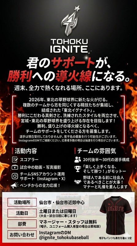 | 連絡事項や アピールポイント | 【創設メンバー募集!】 宮城県内で2026年結成の新チーム! 現在県内のチームから熱意ある選手が10名ほど集まっています! この度、若干名の選手とマネージャー、スタッフを募集します! 20代後半から30代の年齢構成となっておりますが、 それ以下の年齢もご応募受付しております。 コンセプトは「楽しみながら本気で上手くなる、そして勝つ」。 練習は少なめで練習試合、大会やリーグ戦の参加をメインに考えております。 (大会前等は複数回練習を行う予定です) チームの掛け持ちも問題ありません。現在のメンバーも全員が掛け持ちです。 もちろんイグナイト専属選手も大歓迎です! 大会出場が主目的のため、ユニフォームの購入を必須とさせていただきます。 (イウジン社製、帽子・上下セットで23000円程度、支払いは6月初旬の見込みです) 【こんな方を歓迎いたします】 ・年齢20代後半〜30代 ・野球に情熱を持っている方 ・上手くなりたい!と思っている方 ・社会人として最低限のマナーや礼儀を持っている方 一緒に新たなチャレンジをしていただける方からのご連絡お待ちしております! DMからどうぞ!🙇♂️ 少しでも気になった方は、お名前、年齢、野球経験、希望ポジションを記載の上ご連絡ください! |