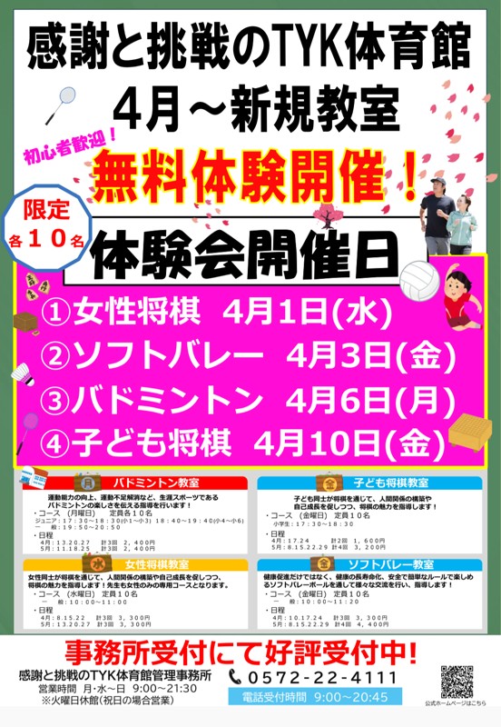 | 連絡事項や アピールポイント | 2026年4月より岐阜県多治見市の感謝と挑戦のTYK体育館でバドミントン教室を開催いたします。 こちらは新規教室で初心者の方を対象に募集しております。 バドミントンを楽しみたい方のご参加お待ちしております。 日程 毎週月曜日 ジュニア:17:30~18:30 (小1~小3) 18:40~19:40 (小4~小6) 一 般: 19:50~20:50 4月:13.20.27 計3回 2,400円 5月:11.18.25 計3回 2,400円 〚バドミントン教室 無料体験会〛 ジュニア・一般 4月6日(月) ※親子で参加も歓迎いたします! 17:30~18:30 小1~小3 第1競技場 18:40~19:40 小4~小6 第1競技場 19:50~20:50 一般 感謝と挑戦のTYK体育館(0572-22-4111)まで ご連絡お待ちしております。 |