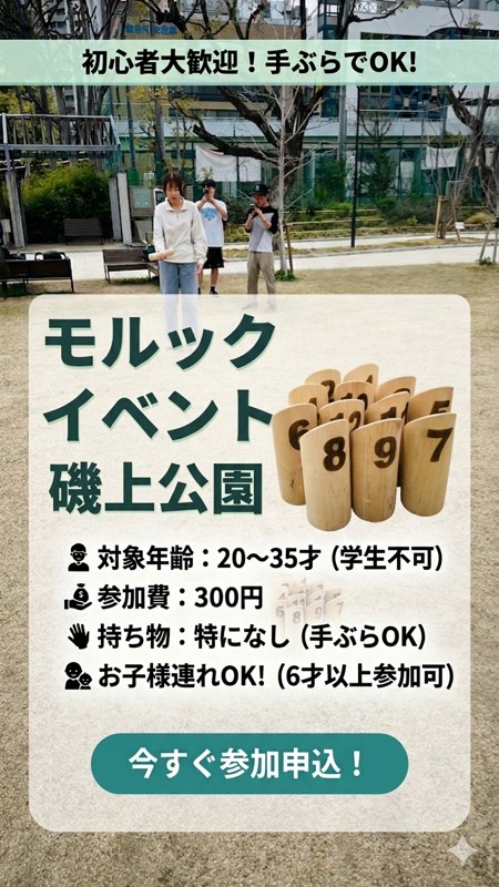 | 連絡事項や アピールポイント | 話題の北欧スポーツ「モルック」を一緒に楽しみませんか? ルールはとっても簡単!初めての方でも5分で覚えられます。 運動が苦手な方も、新しい趣味を見つけたい方も大歓迎です! 【募集要項】 • 対象年齢:20〜35才(※学生不可) • 募集定員:9名(先着順) • 参加費:300円(道具維持費として) • 場所:磯上公園 • 持ち物:特になし!動きやすい服装でお越しください。 〜お子様連れの方へ〜 • お子様との参加も大歓迎です! • お子様も一緒にプレイされる場合は「6才以上」から参加可能です。 • お子様の参加人数も定員に含みますので、事前にお知らせください。 【注意事項】 • 勧誘や営業目的の参加はご遠慮ください。 • 宗教等の勧誘は固くお断りします。 【応募方法】 「参加希望」とメッセージをお送りください! その際、以下の内容を添えていただけるとスムーズです。 1. お名前(ニックネーム可) 2. ご年齢 3. お子様連れの有無(プレイされる場合は人数も) 定員に達し次第、募集を締め切らせていただきます。 皆さんと楽しくモルックができるのを楽しみにしています! |