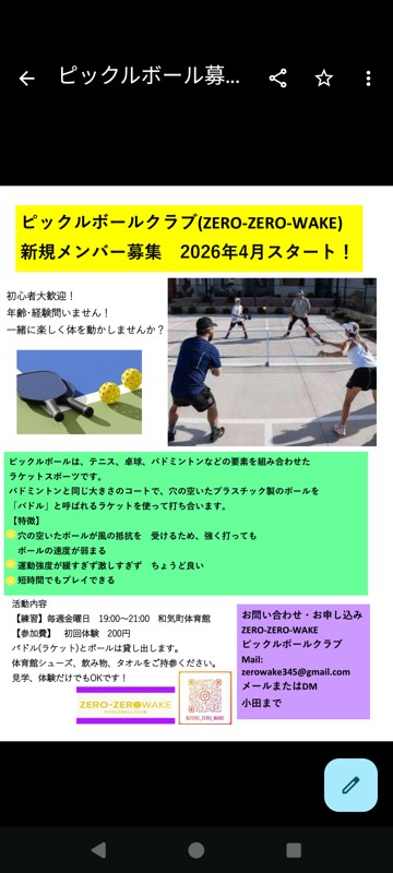 | 連絡事項や アピールポイント | 岡山県和気町でピックルボールクラブが 4月から始動しました。 最近話題のニュースポーツ「ピックルボール」を一緒に楽しみませんか?🏓 テニス・卓球・バドミントンの要素をミックスした、誰でも気軽に始められるスポーツです! 初心者・経験者どちらも大歓迎! 運動不足解消や健康づくり、楽しく体を動かしたい方にピッタリです✨ ■こんな方におすすめ ・新しいスポーツを始めてみたい ・ゆるく楽しく運動したい ・地元で仲間を作りたい 初回体験200円 ラケットやボールは用意があります。 体育館シューズとタオルと飲み物をご持参ください。 見学だけでも大歓迎! 少しでも興味があれば、お気軽にご連絡ください😊 一緒に楽しくプレーしましょう! |
