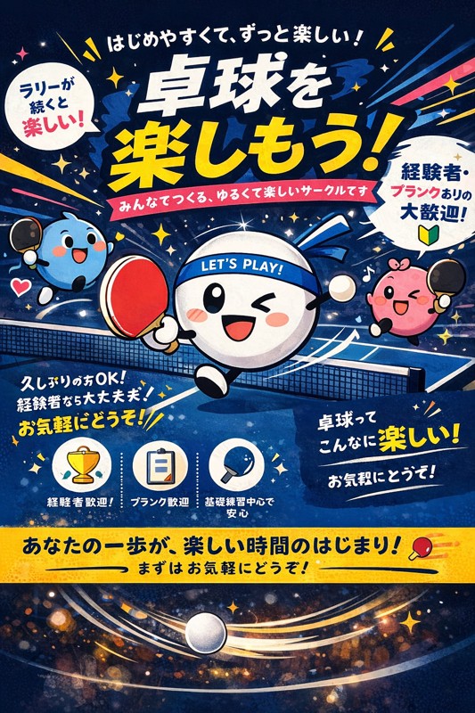 | 連絡事項や アピールポイント | 🏓【日曜午後・卓球メンバー募集】@世田谷(経堂駅近く) 「最近ちょっと運動不足かも」「気軽に卓球を楽しみたい」「もっとうまくなりたい」そんな方、一緒にラリーや基礎練習しませんか? 現在、日曜日の午後に世田谷区内の地区センターで、基礎的な卓球練習をしています。内容はフォアハンドラリーを中心としたシンプルなものなので、難しい技術は必要ありません。フォアハンドである程度ラリーが続けられる方であれば、どなたでもご参加いただけます。 本格的な試合志向というよりは、「楽しく体を動かしながら、少しずつ上達していけたらいいな」という雰囲気です。久しぶりに卓球をする方や、これから継続的に運動したい方にもぴったりです。 ■日時:日曜日の午後 ■場所:世田谷区の地区センター(経堂駅近く) ■費用:無料 ■設備:エアコン完備で快適 ■対象:年齢・性別不問 少しでも興味があれば、ぜひお気軽にご連絡ください。 まずは軽く打ってみるくらいの気持ちで大丈夫です。ご参加お待ちしています Sunday Afternoon Table Tennis – Casual Practice Partners Wanted! (Setagaya, near Kyodo Station) Looking for a fun and easy way to stay active? Why not join us for some relaxed table tennis practice on Sunday afternoons? We currently meet at a community center in Setagaya and focus on basic practice, especially simple forehand rallies. You don’t need to be highly skilled—if you can rally with a forehand, that’s more than enough. The goal is not intense competition, but enjoying the game while gradually improving together. This is a friendly and welcoming environment, perfect for those who want to get back into table tennis after a break, or for anyone looking to build a healthy habit through light exercise. Everyone practices at their own pace, and we keep things relaxed and enjoyable. ■ Schedule: Sunday afternoons ■ Location: Community center in Setagaya (near Kyodo Station) ■ Fee: Free ■ Facilities: Air-conditioned and comfortable ■ Open to: All ages and genders If this sounds interesting, feel free to reach out anytime. Even if you're just a little curious, you're very welcome to join us for a casual hit. We’d love to have you |
