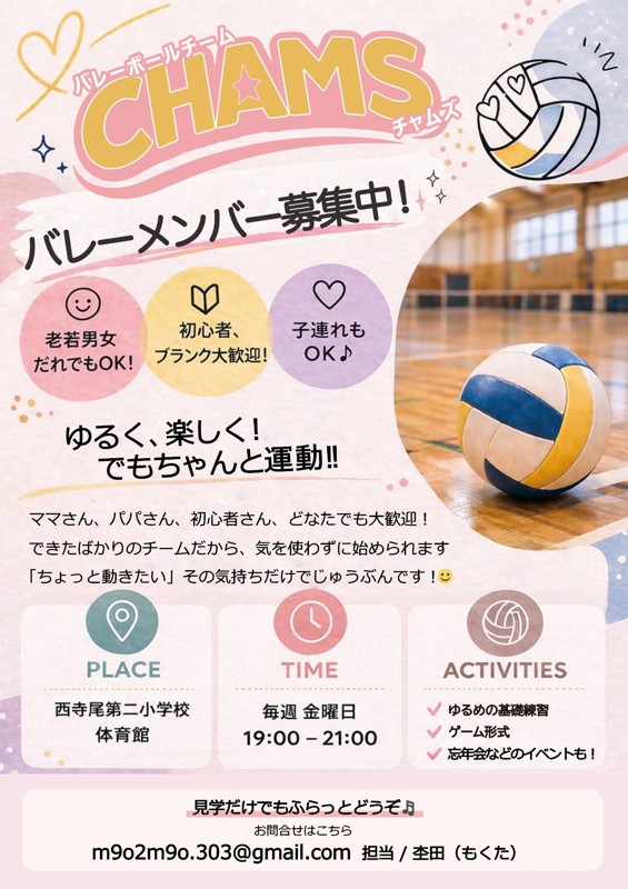 | こんな人を 探してます | 老若男女誰でも大歓迎!楽しく遊びながらバレーしたい人! |