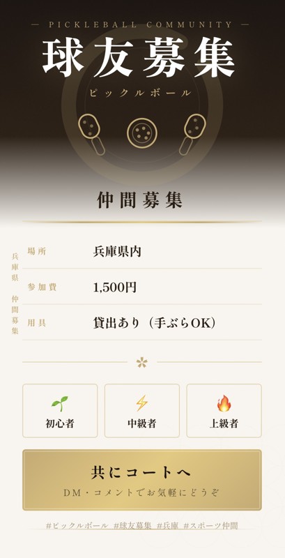 | 連絡事項や アピールポイント | \兵庫で話題沸騰中!全米No.1人気の「ピックルボール」を体験しませんか?🎾✨/ 「テニスより簡単、バドミントンよりエキサイティング!」 今、世界中で爆発的に流行しているピックルボールが兵庫に上陸です! • 「新しいスポーツを始めてみたい」 • 「テニスは難しそうだけど、これならできそう!」 • 「運動不足だけど、激しすぎるのはちょっと…」 → そんな方にこそ、絶対に体験してほしいスポーツです😊 コートサイズはバドミントンと同じくらい。 ラケット(パドル)が短くて扱いやすいので、初めての方でも開始5分でラリーが続くようになります! 【ピックルボールが今、選ばれる理由🇺🇸🔥】 • 初心者でも即ラリー!(運動神経に関わらず、初日から試合が楽しめます) • ちょうどいい運動量!(戦略性が高く、体だけでなく頭も使うので飽きません) • SNS映えする可愛さ!(パドルやボールがカラフルで、女性にも大人気) • コミュニティが温かい!(ダブルスが基本なので、自然と仲間が増えます) • 兵庫の綺麗なコートで!(開放感のある環境でリフレッシュ) 【参加費】 初回: 1,500円 2回目以降 1,000円 (コート代・ボール代として。参加人数により変動します) 【服装】 動きやすければなんでもOK! • Tシャツ × ショートパンツ or レギンスなど • テニスシューズ、または室内用運動靴(開催場所によります) 【持ち物】 飲み物、タオル、外履き/内履き用シューズ ⚠️ 専用パドル(ラケット)は無料でレンタル可能です!✨ (手ぶらで、お試し感覚でどうぞ!) 【活動内容】 1.ミニレクチャー(ルールはとってもシンプル!3分で覚えられます) 2.基本練習(パドルの当て方やサーブの練習を少しだけ) 3.ラリー体験(まずは繋げる楽しさを実感しましょう!) 4.ゲーム形式(ダブルスでワイワイ対戦!笑い声が絶えません☺️) ※未経験者・初心者の方が中心の、ゆるくて楽しい雰囲気です。 【5月スケジュール】 5/2(土) 11時〜13時 @ミズノスポーツプラザ潮芦屋 【こんな方にぴったり!】 • 兵庫・神戸エリアで新しい趣味を見つけたい • テニス、バドミントン、卓球の経験がある(もちろん未経験も大歓迎!) • 最新のトレンドスポーツをいち早く体験したい • 週末に気持ちよく汗を流したい社会人 • 「まずは楽しく!」がモットーの方(←ここが一番重要です!) 【お願い】 • 金銭のやりとりは自己責任でお願いします(トラブル防止) • 営業・宗教・ビジネス目的の参加はご遠慮ください🙅♀️ • 笑顔でプレーできる方限定!(ミスしても「ナイス!」と言い合える雰囲気を目指しています) 【参加希望・お問い合わせ】 以下を添えて、DMまたはメッセージをください👇 • 名前(ニックネームOK) • 年齢層(20代、30代など) • 性別 • ラケットスポーツ経験(あればでOK!) 「ピックルボールって何?」という方も、一度やればその楽しさがわかります! 兵庫の新しいスポーツコミュニティを一緒に作りましょう〜🎾✨ |