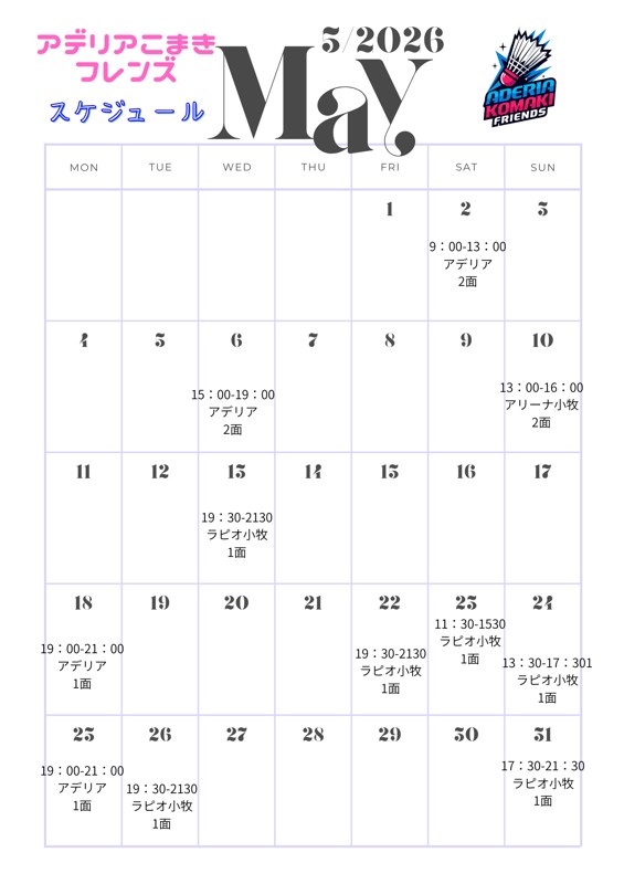 | 連絡事項や アピールポイント | 岩倉市・小牧市中心のバドミントンサークル「アデリアこまきフレンズ」 初心者から上級者まで幅広く募集しています! 年齢層は20代・30代を中心に、子供から大人まで老若男女問わずどなたでも大歓迎です。 まずは一度気軽に参加してみてください! 出欠連絡や開催情報はLINEグループで行っています。 「来れる時だけ参加」でOKです。無理なく続けられます♪ 参加費用 ・1回 700円(人数や時間によって多少前後する場合があります) ・初回は600円 お支払いは現金またはPayPay対応です。 参加当日の持ち物 ・ラケット(無い場合初回は貸出しいたします) ・飲み物 ・体育館用上靴(必須) ・タオル ・運動できる服装 ※シャトルはサークルで用意します! 参加希望の方は以下の情報を教えてください! (ハンドルネームでもOKです) 名前: 性別: 年齢: バドミントン歴: ラケットの有無: 情報をお送りいただければ、開催日程をお知らせします 4月練習日程 27月アデリア総合体育文化センター 19:00~21:00 29祝ラピオ小牧まなび創造館 17:30~21:30 30木アデリア総合体育文化センター 13:00~17:00 5月日程はインスタグラムでご確認ください https://www.instagram.com/aderia_komaki_friends/ |