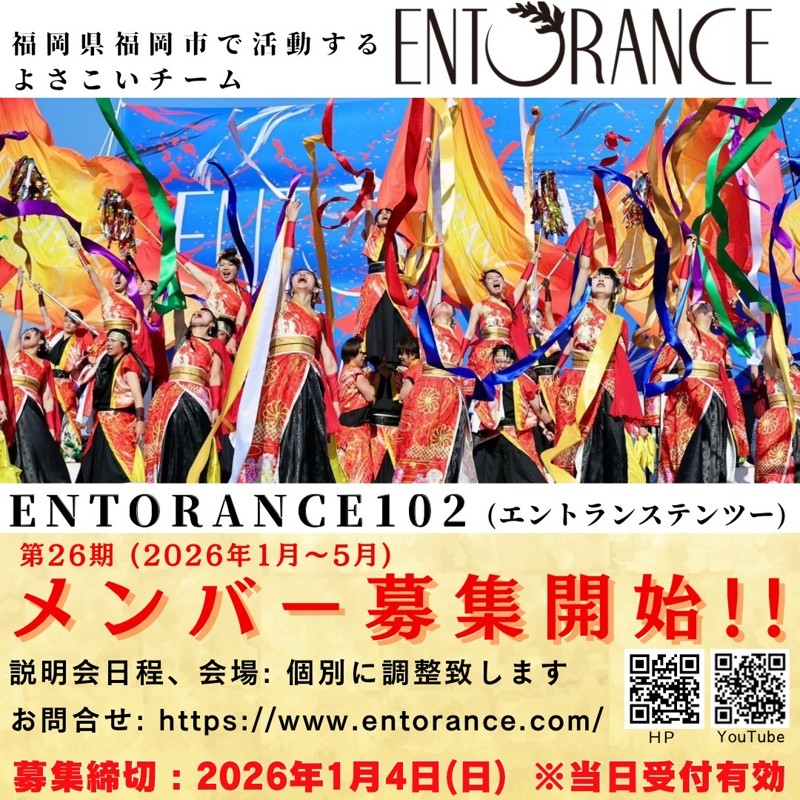 | 連絡事項や アピールポイント | 福岡市を中心に活動してるよさこいチーム「ENTORANCE102」です!! よさこいチームENTORANCE102(エントランステンツー)は 2026年よりスタートする第26期活動を共に行う新規メンバーの募集を開始しました。 募集期間は〜1/4(日)までを予定しています。 福岡を中心に九州内のお祭りに主に参加しています! また、カナダで毎年行われておりますJapan Festival Canadaにも出演させていただいております。 未経験からでもいろいろなことに挑戦できるチームです☆ 活動に興味のある方は新規説明会を個別対応にて実施致しますのでどうぞお気軽にお問い合わせください◎ 説明会では... チームがどのような活動をしているか紹介させていただいてます。説明を聞いてみて、やってみようかな...思ってたのと違うな...などご検討いただけたらと思います^^説明会は福岡市内のカフェなどで行っています^^ 未経験の方大歓迎です! (未経験の方の方が多いです) ================== ★現在ENTORANCE102では他よさこいチームとの掛け持ちはできませんのでご了承下さい。 ★お問い合わせはホームページのメンバー募集ページ「問い合わせフォーム」よりお願いいたします。 ★こちらのメッセージからでも構いません♪ 【活動記録】 2024年 ・3/28 九州がっ祭「敢闘賞」頂きました☆ ・4/28 大ハンヤ鹿児島春祭り「ANA賞」頂きました☆ ・5/3 博多どんたく港まつり『博多駅前ストリート』演舞させていただきました☆ ・5/19 黒崎よさこい祭り 新作お披露目 「審査員特別賞」頂きました☆ ・8/4 わっしょい百万夏祭り 「感動大賞!」頂きました☆ ・8/17.18 Japan festival Canada2024 出演させて頂きました☆ ・YOSAKOIさせぼ祭り 「敢闘賞」頂きました☆ ・11/16.17 ふくこいアジア祭り 「JR九州賞」頂きました☆ 2025年 ・3/23 九州がっ祭 「準大賞」頂きました☆ ・4/27 かごしま春祭大ハンヤ 「ANA賞」頂きました☆ ・5/3 博多どんたく港まつり 博多駅前ストリートにて演舞させていただきました☆ ・5/3 福岡市民ホール開館記念イベント 演舞させていただきました☆ ・5/18 黒崎よさこい祭り 「大賞!」頂きました☆ ・6/15 太宰府門前真舞祭 「Eブロック大賞」頂きました☆ ・8/16.17 Japan Festival Canada2025 出演させていただきました☆ ・9/21 わっしょい百万夏祭り 「感動大賞!」頂きました☆ ・10/12 かすやYOSAKOI祭り 演舞させていただきました☆ ・10/18.19 YOSAKOIさせぼ祭り ブロック予選突破/ファイナル進出 ありがとうございました☆ ・11/15.16 ふくこいアジア祭り ブロック予選突破/ファイナル進出 「西日本鉄道賞」頂きました☆ ・11/23 サンタクロースパレード(in Canada tronto) カナダのトロントにて演舞させていただきました☆ --------------------------------------------------------- ▽ホームページはこちら▽ https://www.entorance.com ▽演舞動画はこちら▽ https://youtu.be/uxsGYg6LMJk?si=TFNm0JC9YFcSo_eh (もしくはyoutubeにてENTORANCE102と検索!) ▽日々の活動はこちら▽ <Instagram> https://www.instagram.com/entorance102/ |