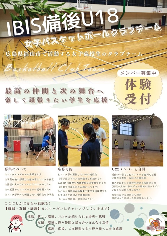 | 連絡事項や アピールポイント | 詳しくはホームページをご確認下さい! インスタグラムも更新中! 🏀メイン団体『IBIS備後』🏀 社会人女子バスケクラブチームIBIS備後 メンバー随時募集中! 大学生も参加できます。 🏀IBIS備後U18のメンバー募集🏀 広島県の備後地方で女子高校生のクラブチームできました✨ バスケを頑張れる場所が欲しいという高校生へ! 練習場所がほしい中学生もどうぞ! 参加日は週1からでも大丈夫です。 ホームページ下部に詳細あります。 ⚠️ 親御さんなど男性の付き添いでという場合はご相談下さい。 ☆☆☆☆☆☆☆☆☆☆ 女子バスケサークルのホームページを掲載しており、女性は随時体験歓迎です。 また、ホームページ内にU18バスケのページを記載しました。 福山と尾道など備後地域で女子高校生がバスケを新しいバスケのカタチ、諦めなくていい場所をと活動開始😆 地域貢献を含め皆様により良いバスケットボールができる環境のためこれからも努力してまいります。 ご意見などあれば何でもお聞かせ下さい。 |