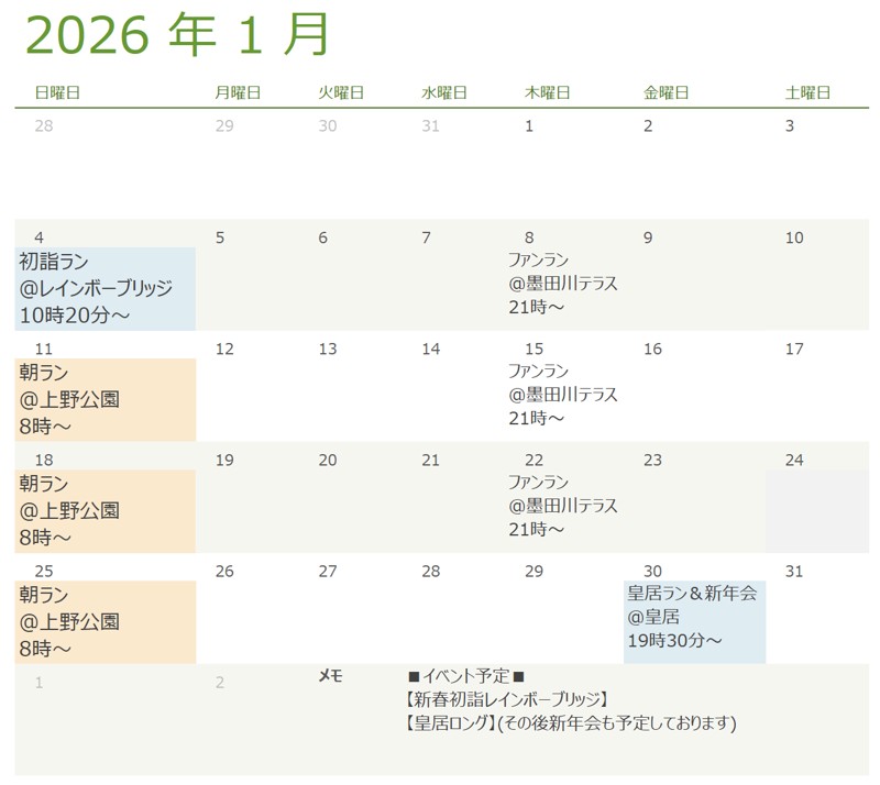 | 連絡事項や アピールポイント | 【ランスルとは】 台東区ランニングサークルの事です。 台東区だけでなくランニングを共にできる方の集まりです。 『週1回でもいいからみんなとワイワイ走る日があってもいいな』 マラソン大会に一緒に出るメンバーを探したい! ランニングを通じて友達を増やしたい! と思っている、20代~40代の男女を、常に募集しております! 【活動場所・日時について】 ◆拠点 上野公園を中心にランニングしています。 ◆日程 (2026年1月現在) 毎週 木曜夜 21時~ 日曜朝 8時~ その他突発的に走れるメンバーを募集する【個人企画】の日もあります。ホームページ内カレンダーに記載したりメンバー同士の連絡網を使って告知しております。 例:24時間リレーマラソンに参加 :赤羽ランからのはしご酒 ◆参加費用について 基本無料です。ランニングステーションと飲み会やご飯に行く場合は自費のみかかります。 ◆集合場所 〖朝ラン〗上野公園内スタバ前 〖夜ラン〗稲荷町駅前ベローチェ前 【今後の活動予定】 ※画像の予定表をご確認下さい ※過去の活動実績についてはホームページをご覧ください。 ◆こんな方をお待ちしております。 ・とりあえず一度見学したい ・ランニングが初心者だから続けられるか不安だしどうやって走ればいいかわからない ・同僚や仲間に『ランニング始めたんだ!』とプチ自慢したい ・東京都に友人が欲しい ・マラソンに参加する仲間を増やしたい 等など まずはご連絡下さい。 ドタンバでの参加、キャンセルOKです。遊びにくるような感じで御連絡下さい。 最後までお読みいただきありがとうございました。 あなたと一緒に走れるのを楽しみにしております(^_-)-☆ 【最後に応募要項】 メンバーとして参加希望いただける方は 下記内容を記載してご連絡下さい。 ===================== 氏名(かな): 生年月日: 年 月 日 性別: 初回の練習会参加日: その他一言: ===================== |