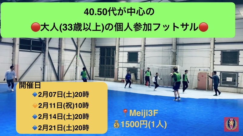 | 連絡事項や アピールポイント | 当クラブは 40.50代が中心の 個人参加フットサルに なります。 参加条件は”33歳以上”で男女問わず 経験問わずです。 (スタッフ女性も参加します) 【開催日時と場所、参加費(キャンセル規定)】 ・毎週土曜日20時~22時 以降のスケジュールは画像にてご確認下さい。 ・メイジフットサル3F屋内コート 以降の開催日は画像にてご確認下さい。 参加費:1500円(1人) (開催日の24時間以内のキャンセルは 全額御請求致します。) 【お申込みの注意】 メッセージにて 『御名前(フルネーム)』 ※ニックネームは不可 『御性別』 『御年齢』 『参加希望日』 の4点は必ず御記載のうえ メッセージをお願いします。 ※グループ参加の場合は それぞれの方の記載をお願いします。 また1グループは3名までとさせて 頂きます。 ※グループ割引始めました 画像ご確認下さい。 【内容及び注意事項】 10分のアップ、 ゲームになります。 勝ち負けを争うのではないので、 ・球際、激しいチャージは御遠慮下さい。 ・強シュートも危険の為、御遠慮下さい。 ・女性も参加されますので、上記は特に注意 ※注意事項は、画像にも記載しております。 その他、ご不明な点がございましたら お気軽にお問い合わせください。 お問い合わせ、お申込み お待ちしてます。 |