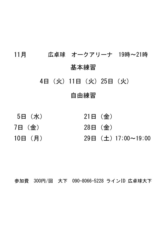 | 連絡事項や アピールポイント | 卓球の基本練習をするところとして作りました 現在広小、広中学校、白岳小、白岳中学校の生徒、広高校の 学生を中心に、基本練習から試合参加までしてます 大人もそれに加えて練習しています ひと月に10回程度練習して、試合に参加できる人から選抜して、呉卓球協会主催の試合に参加しています 子供さんに卓球をさせてみたい方は一度見学にお越しください 卓球を基本からきちんとできるようになりたい方、またより一層強くないたい方、卓球をしたい方募集中です 参加費は一回300円、呉市広にある、オークアリーナにて19:00からやってます 初心者(小中学生、大人)も卓球できるようになるまで、私が教えます できるようになった段階で他の方と練習していきましょう |