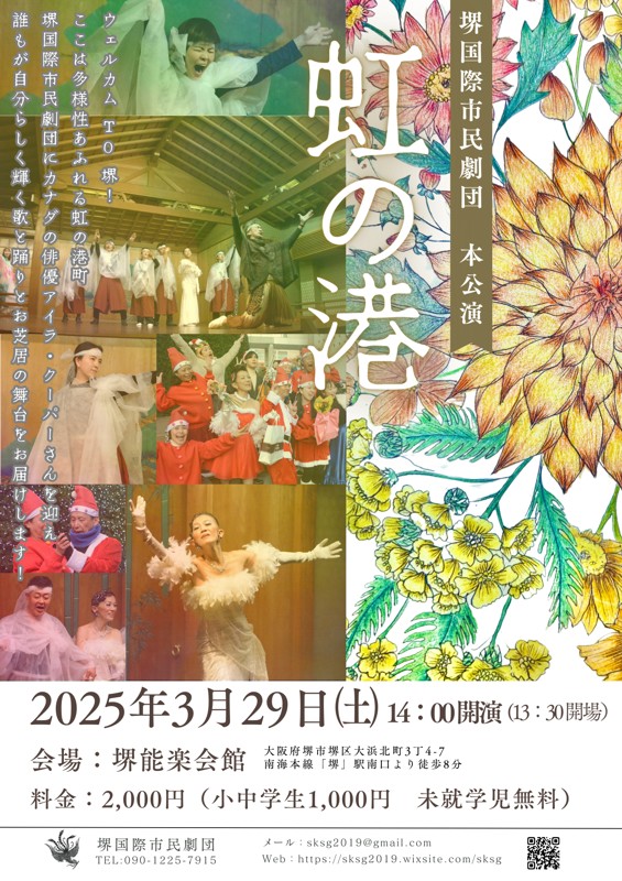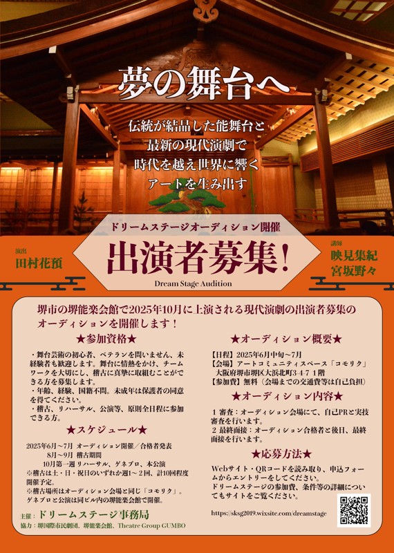 | 連絡事項や アピールポイント | 【オーディション情報】 能舞台に立ち、現代演劇を! 10月公演に向けたオーディションを開始します。 運営はドリームステージ事務局。 紹介は以下のサイトをご覧ください。 https://sksg2019.wixsite.com/dreamstage ■講師 演劇:田村佳代先生(女優・演出家)/Theatre Group GUMBO代表。海外の国際演劇祭での受賞歴多数。2019年には北米最大の演劇祭エドモントン国際演劇祭で、アジア人としてはじめて批評家賞を受賞。香港フリンジクラブ名誉会員。 ■堺国際市民劇団演劇教室 海外の演劇祭で活躍するプロのアーティストを講師に迎え、海外アーティストとの国際交流を交えながら、障がい、年齢、性別、国籍、舞台経験の有無関係なく一般の市民が気軽に演劇活動できる劇団です。 デバイジングシアター(共同創作)と呼ばれる手法で創作・レッスンに励んでいます! 一緒に舞台に立ちたいという熱意ある方を募集しています! 演劇経験の有無は問いません。まずは無料体験や見学のお申込をお気軽にどうぞ。 練習日:毎週金曜日 会 場:堺市立総合福祉会館 入会金:10000円 参加費:月謝10000円 ※その他、衣装レンタル代、チケットノルマなど。 ■堺国際市民劇団 文化教室(AYTF Team JAPAN) アジアを中心に世界十数カ国が参加する若者のためのフェスティバルAsian Youth Theatre Festivalへの参加を目指すため演劇と殺陣を軸に日本文化を学ぶ教室です。AYTFは、6月にレジデンシープログラム(合宿)、11月にフェスティバルが開催予定です。開催地はアジア各国で持ち回りです。 ※参加者募集が開始されれば、こちらでも掲示いたします。 その他、ご質問などはお気軽にどうぞ! |